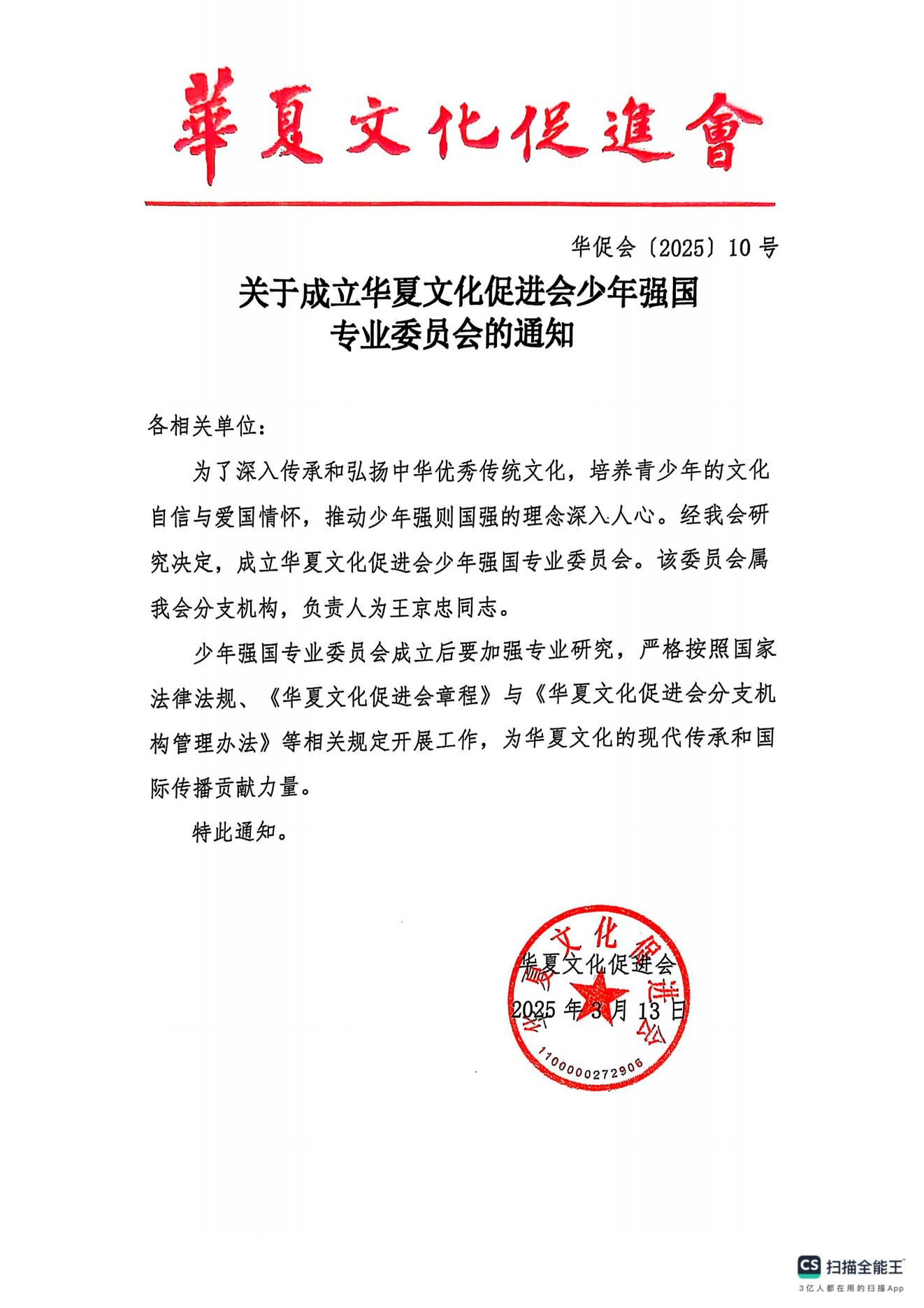 关于成立华夏文化促进会少年强国专业委员会的通知